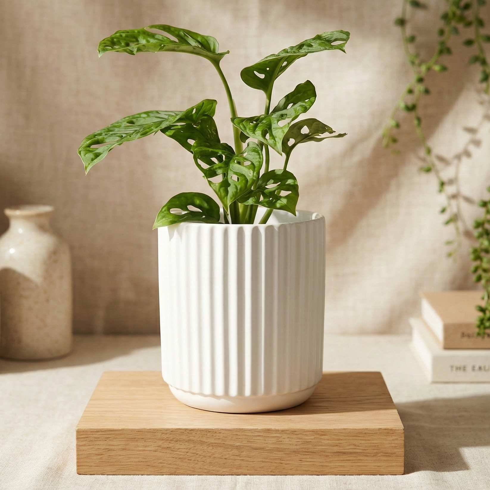 Perfect for gift-giving, this potted houseplant in a classic white ribbed ceramic pot gift is a unique and thoughtful way to bring both elegance and the beauty of nature into any home.