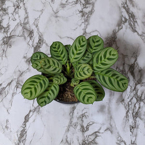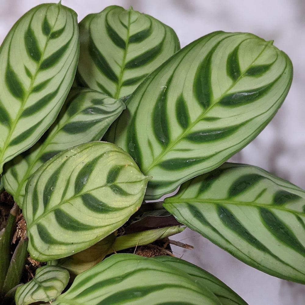 The beautiful herringbone patterned leaves of a Ctenanthe burle marxii plant are made to be flaunted! Don't be alarmed if you see the leaves of this fishbone prayer plant moving - just sit back, relax and check out the lovely purple undersides in the evening.